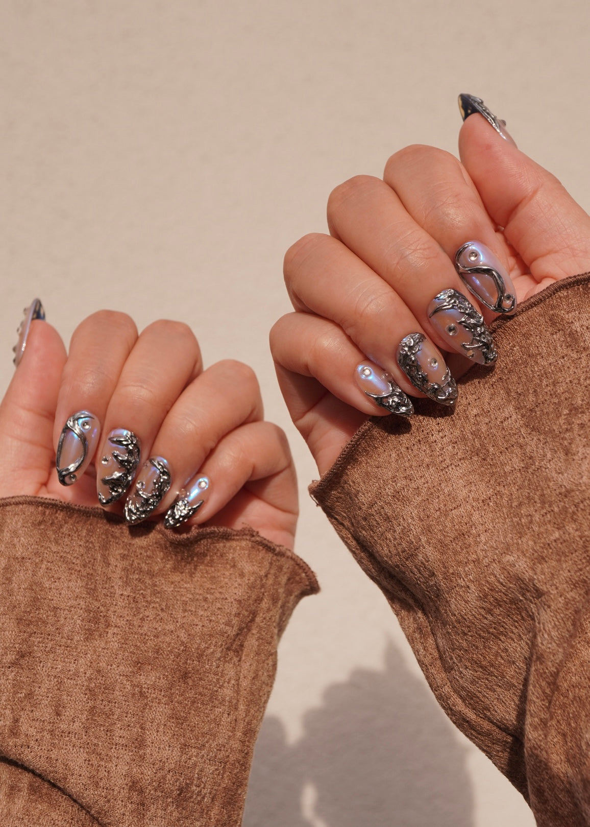 Each design in this collection showcases a mesmerizing liquid metal effect, creating an illusion of molten metal frozen in time. The high-shine chrome finish amplifies the dramatic textures, making these nails a true statement piece.