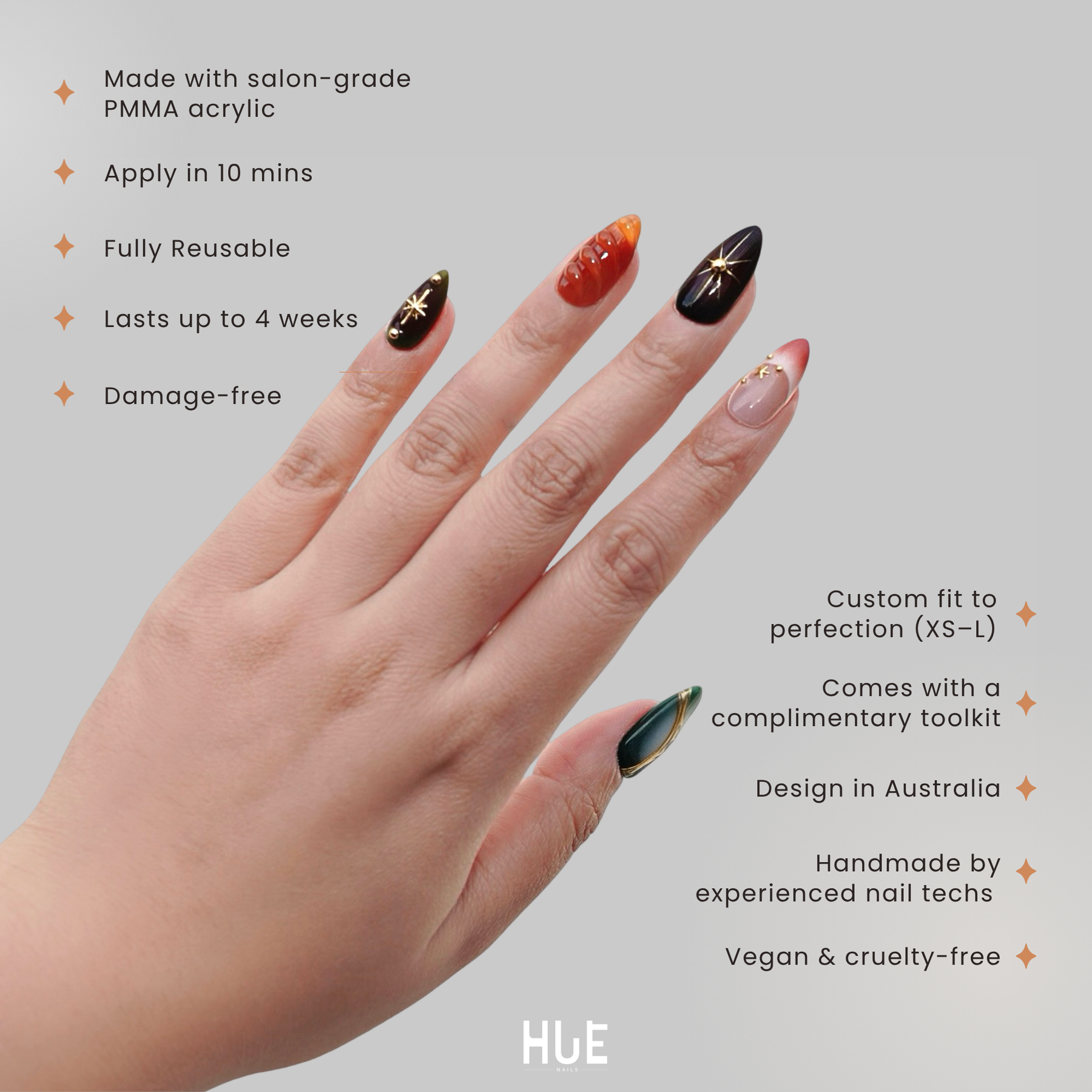Each one is carefully handcrafted using high-grade PMMA acrylic which are sturdy, durable, and just as strong as salon acrylics.