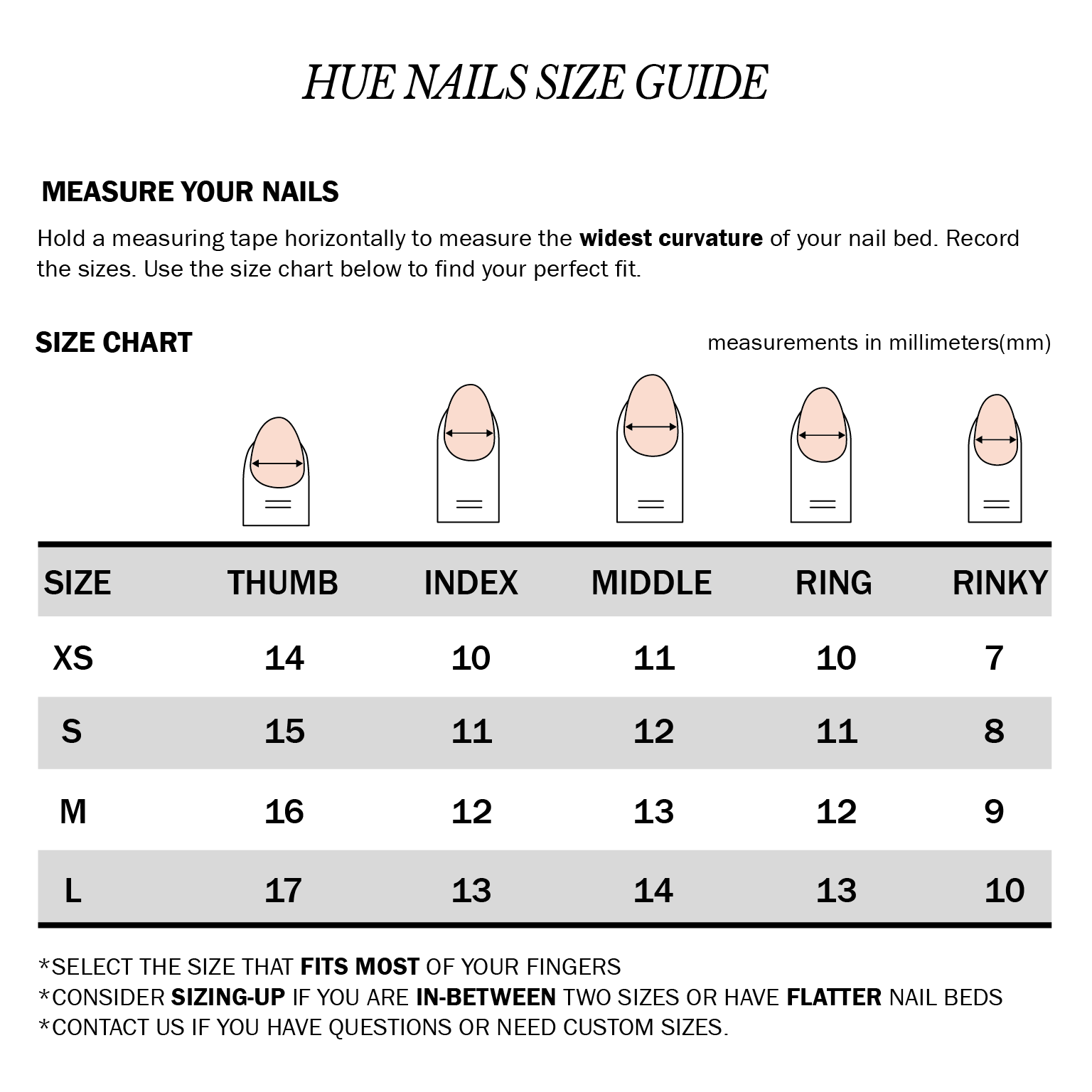 Please note that the size chart applies exclusively to HUE Nails and is designed to the following finger measurements.
